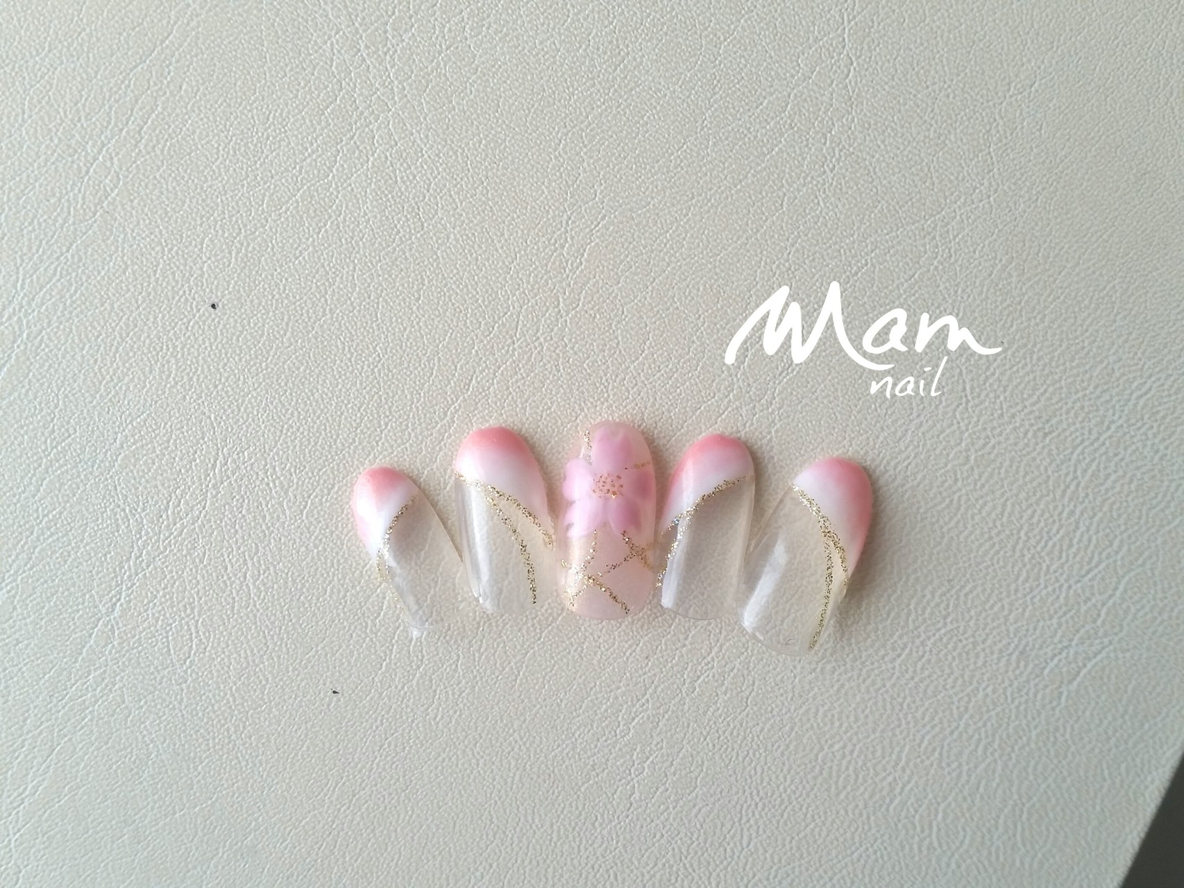 今月のキャンペーンネイルです。 桜モチーフ と レース。 ラグジュアリーテイスト と アンティークフラワー。 すべてペイントです。